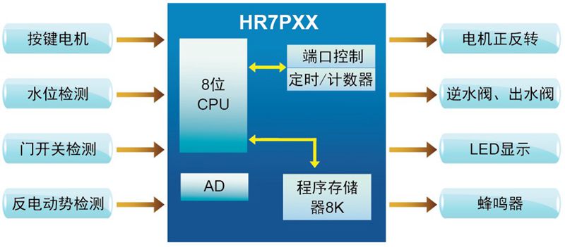 功能說明: ①電機轉速可調節。 ②支持水位檢測。 ③進出水自動控制。 ④電機堵轉保護。 ⑤LED燈指示工作狀態。 | 特征說明: ①掉電數據可存儲在芯片中。 |